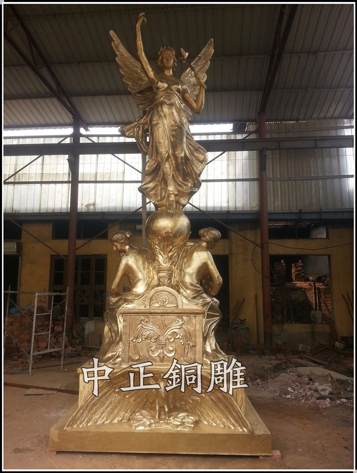 安裝于山東萊陽市山水華庭地產,高6米女神銅雕塑,采用國標62黃銅制作,內附鍍鋅骨架,表面效果為貼金效果,采用24K真金金箔,雕塑整體更顯高貴華麗。