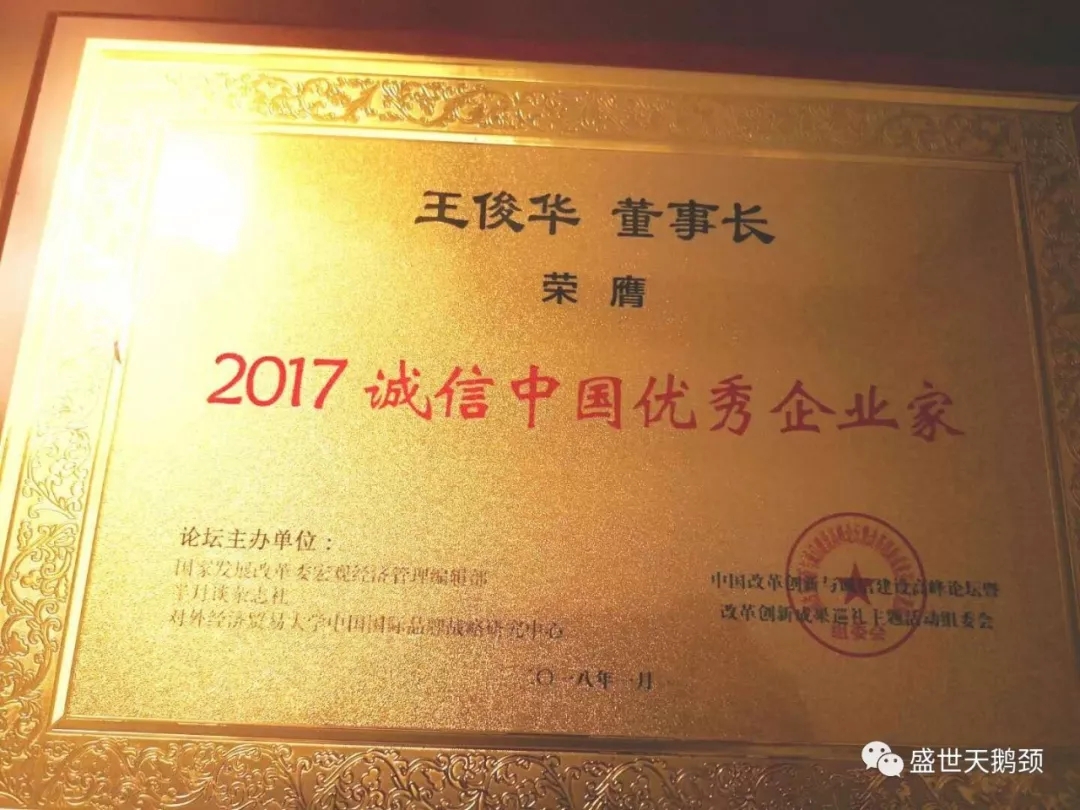經評選盛世集團被主辦方授予雙項權威榮譽。在全國人大副委員長周鐵農、國務院參事林毅夫等領導和專家的見證下,盛世集團董事長王俊華女士,被授予【2017誠信中國優秀企業家】榮譽稱號。