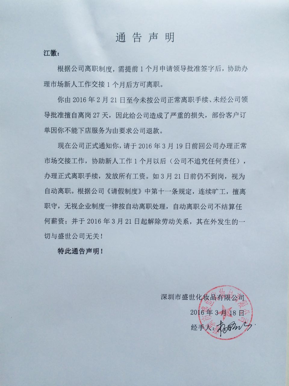 關于公司離職制度的通告聲明
